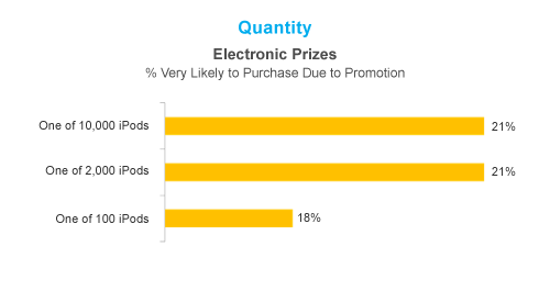 As shown in the example above, increasing the quantity of prizes from 2,000 to 10,000 iPods shows no increase in promotion performance. In fact, increasing the quantity from 100 to 2,000 only increases performance by 3 percent. Determining the most effective prize pool can translate into substantial savings for your promotional budget.